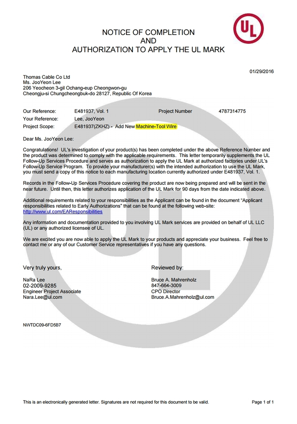 UL MTW Approval Letter